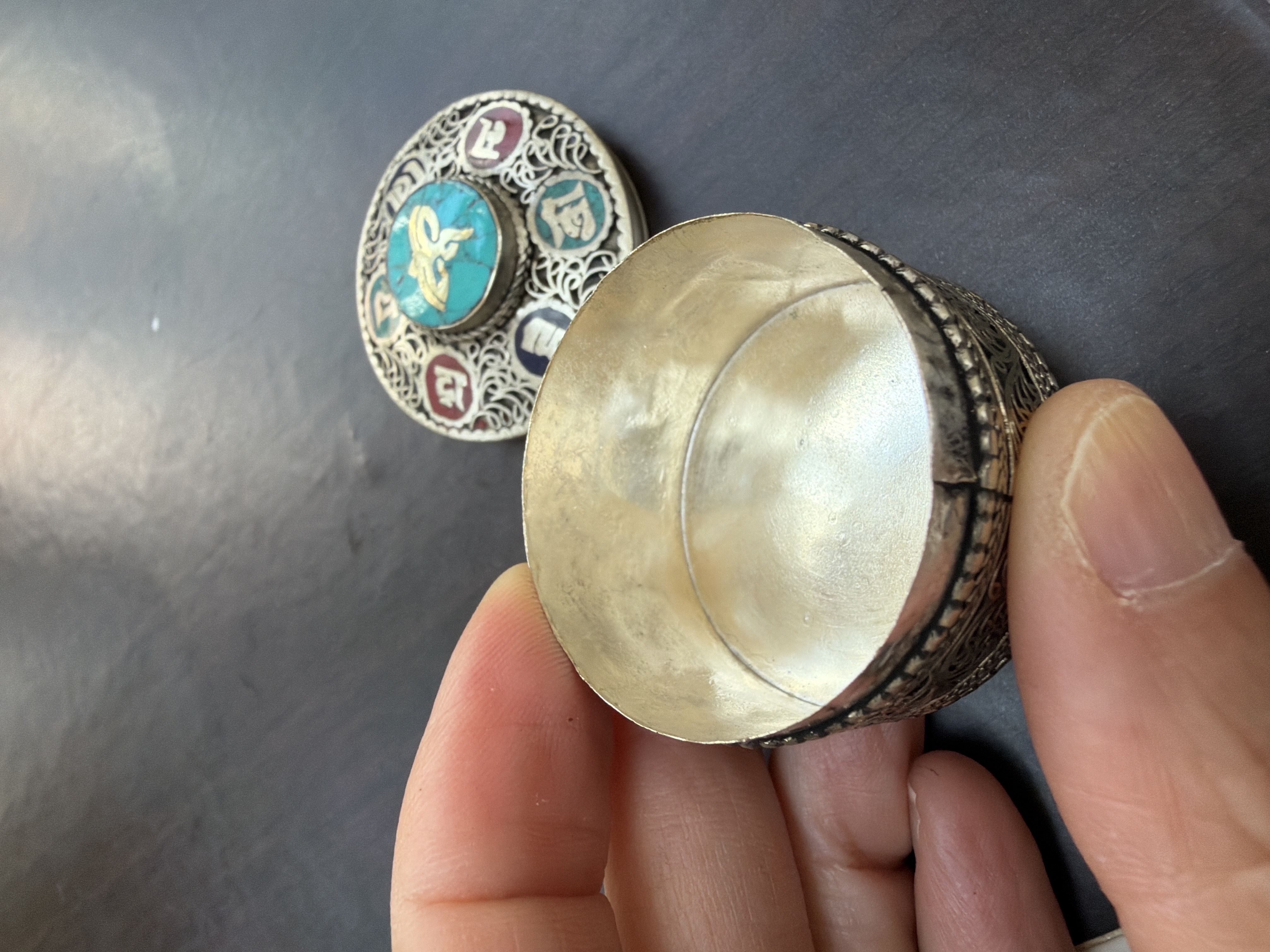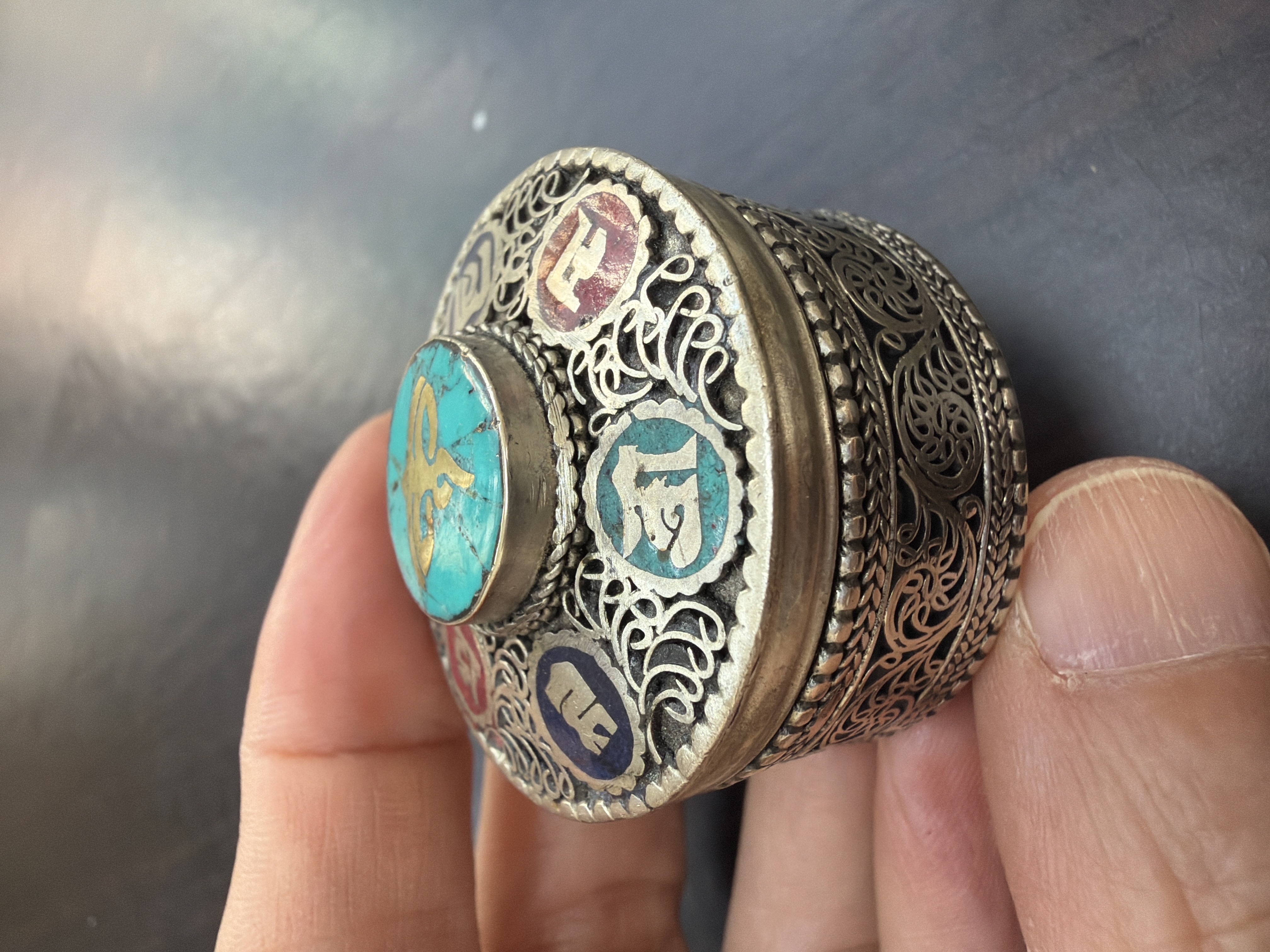 新 尼泊爾民族風六字大明咒OM寶石銀盒仔 (青金石、紅珊瑚)