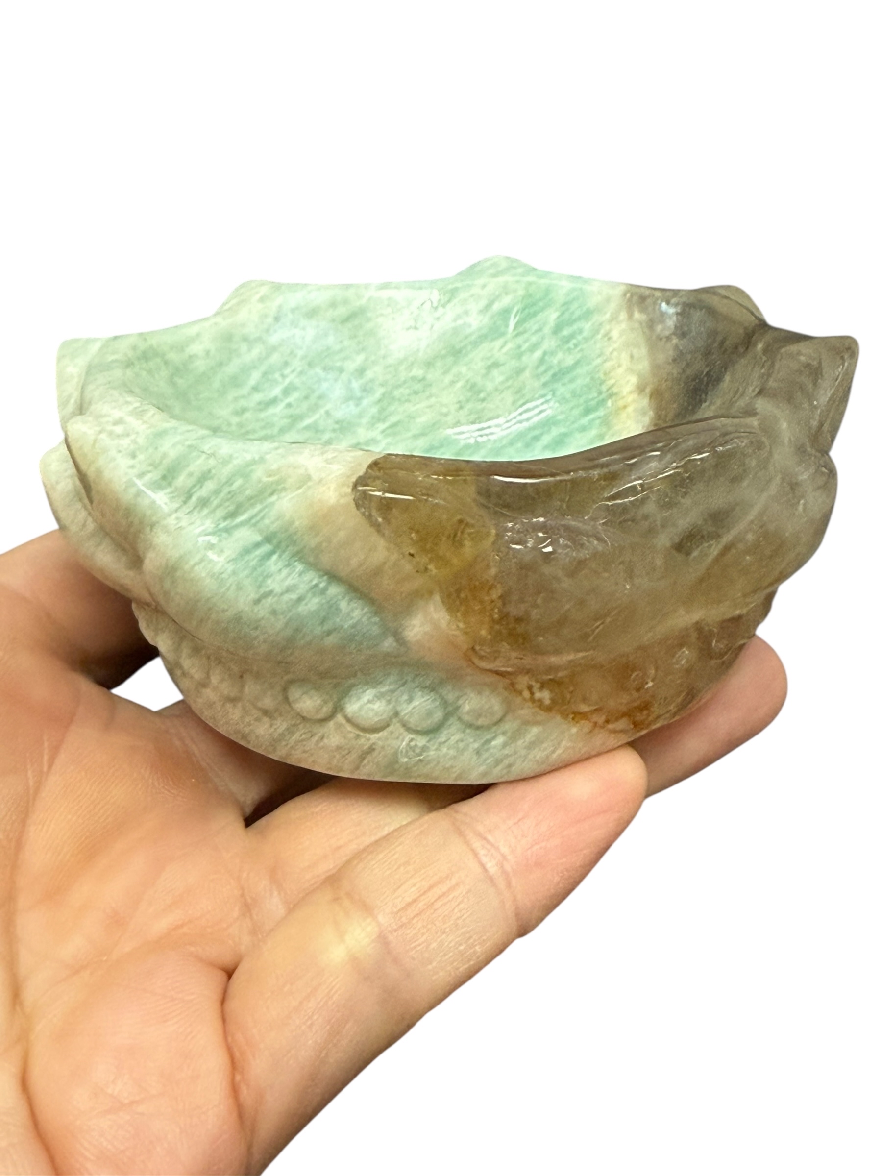 #3 純天然白水晶+天河石共生雕刻蓮花座 (宜淨化手串、供佛)帶天然的紋絡,均屬正常7.5cm 口徑