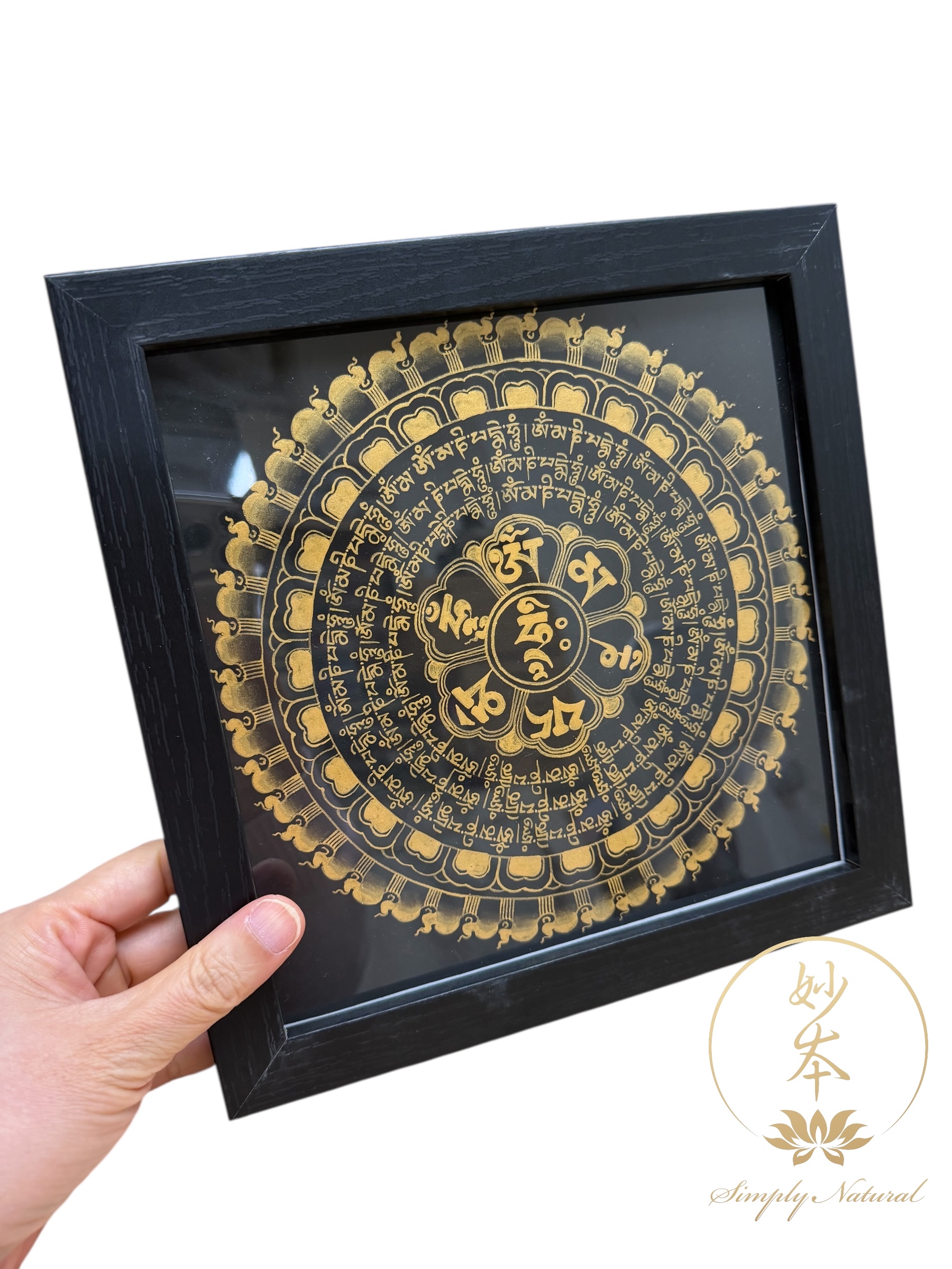 #4 加持尼泊爾手繪唐卡~黑金六字大明咒23.5cm*23.5cm(含畫框)