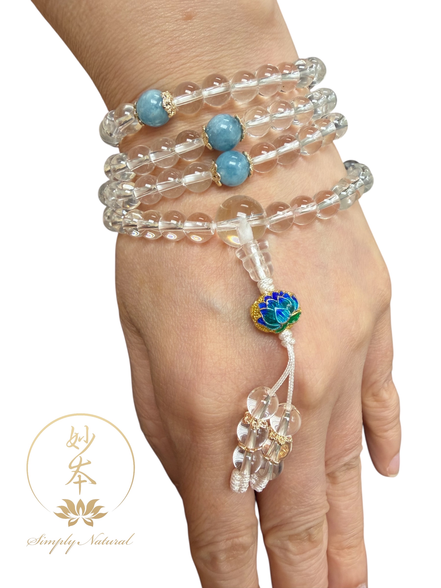 6mm 108粒印度白水晶念珠 配:海藍寶、蓮花
