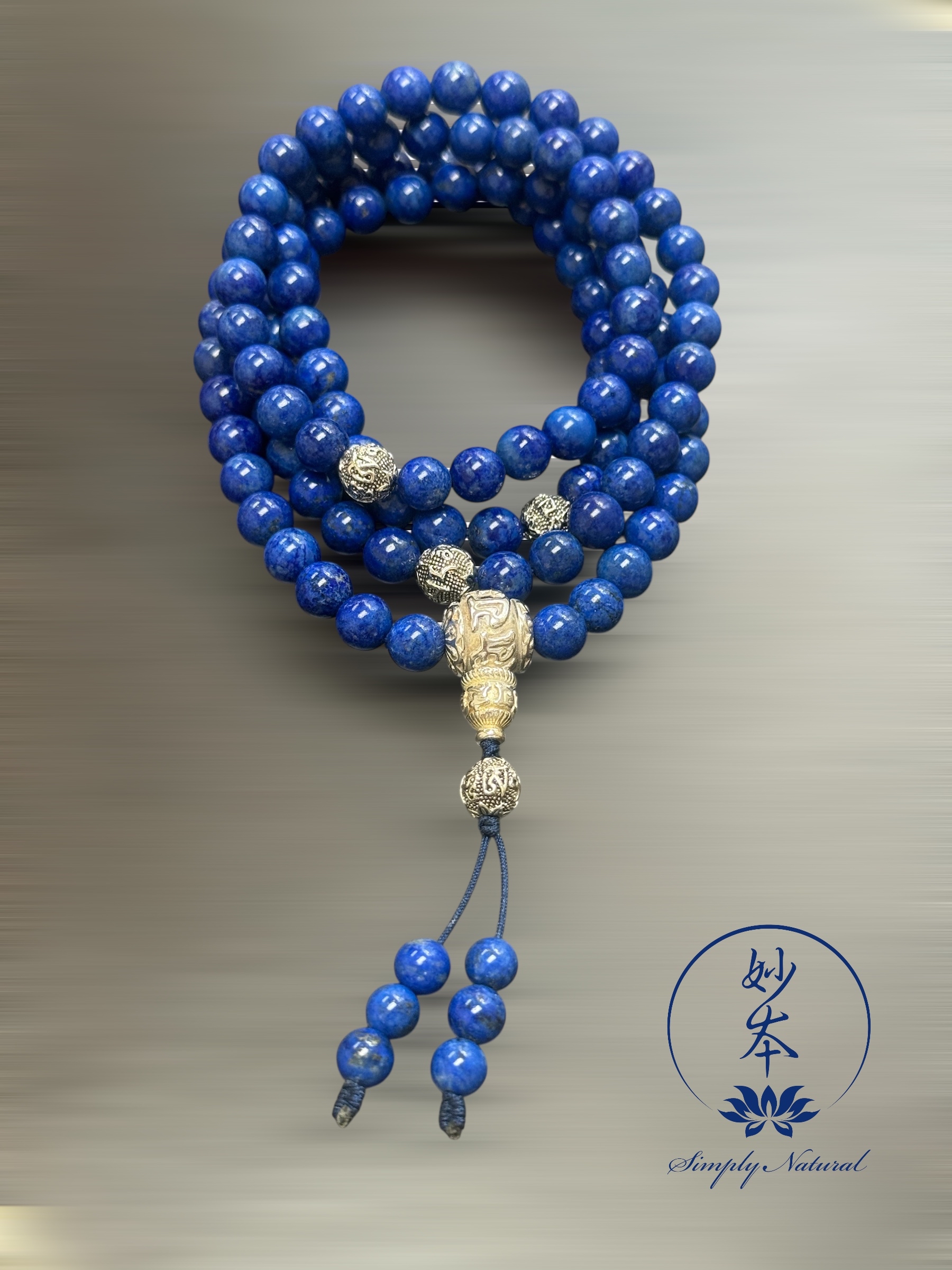 青金石是一種深藍色的寶石,具有強大的能量,可以幫助人們平靜心靈、緩解壓力。108粒青金石念珠可以幫助人們集中注意力、提高專注力。藥師佛心咒是一種非常殊勝的咒語,可以幫助人們消除業障、增長福慧。 這款青金石念珠由108粒青金石珠子串成,每顆珠子直徑為7mm。念珠的末端有一個藏銀製成的佛頭,佛頭上刻有藥師佛心咒。這款念珠非常適合佩戴在身上,可以隨時隨地念誦六字大明咒,以獲得佛法的加持。 這款青金石念珠具有以下特點: * 由108粒青金石珠子串成,每顆珠子直徑為7mm。 * 可以幫助人們平靜心靈、緩解壓力。 * 可以幫助人們集中注意力、提高專注力。 * 可以幫助人們消除業障、增長福慧。 這款青金石念珠是送給朋友或家人的一份非常有意義的禮物。它可以幫助他們在精神上得到提升,獲得佛法的加持。